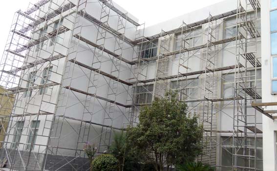 目前,辦公樓外墻裝修工作已經(jīng)過半,已完成的部分煥然一新,室內(nèi)裝修工作也在有條不紊地進(jìn)行中。